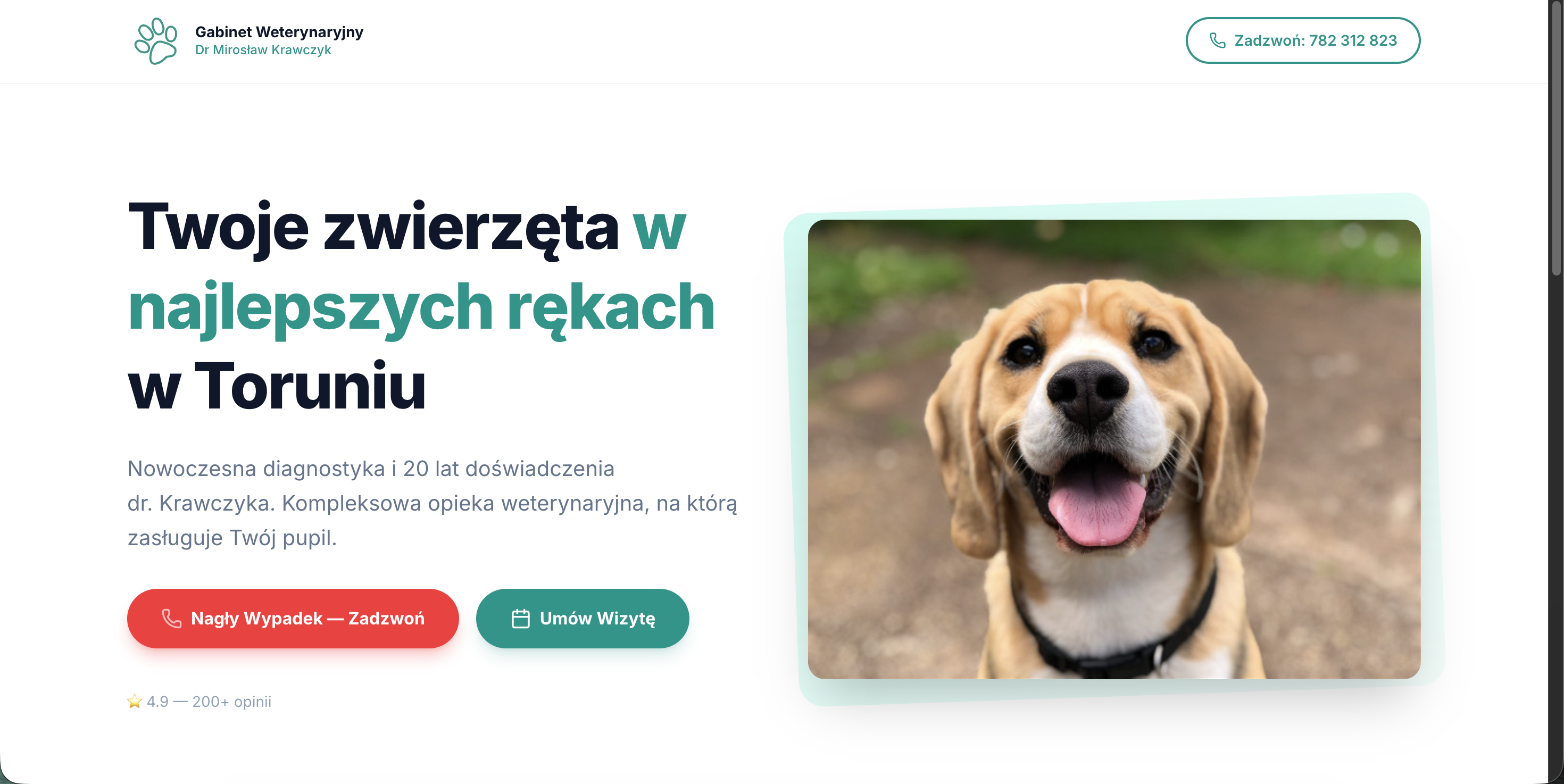 Przejrzysta i budująca zaufanie witryna medyczna. Zaprojektowana z myślą o łatwym kontakcie i intuicyjnym UX dla właścicieli zwierząt.